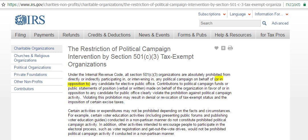 - צילום מתוך אתר רשות המס בארה"ב האוסר על ארגונים הנהנים מפטור 501 לפעול נגד מועמד פוליטי